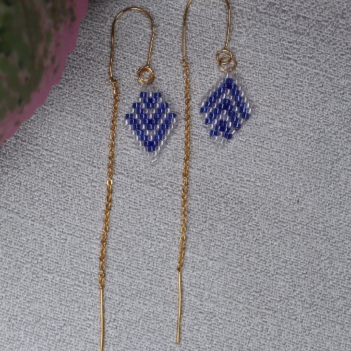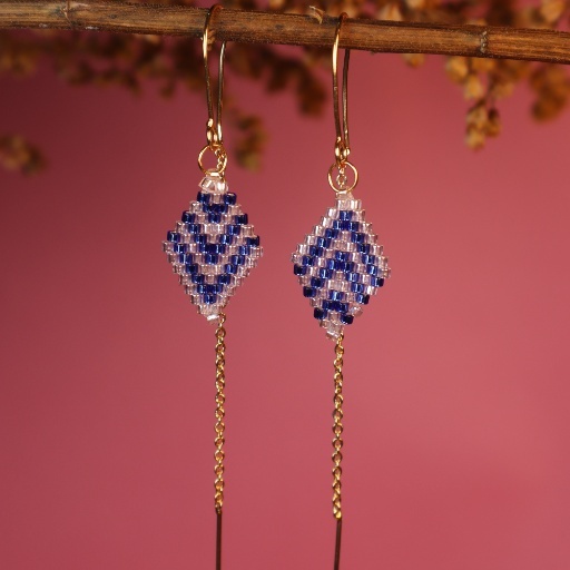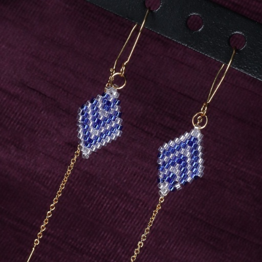Add a touch of elegance and charm to your look with our Blue Diamond Drop Threader Earring. Featuring a delicate handwoven diamond pattern in shades of blue and white, this earring combines traditional beadwork with a modern silhouette. The lightweight design gracefully suspends from a gold-plated hook and finishes with a fine chain threader that adds subtle movement and shine. Perfect for casual outings or dressy occasions, this earring is a unique blend of artisanal craftsmanship and minimalist beauty.