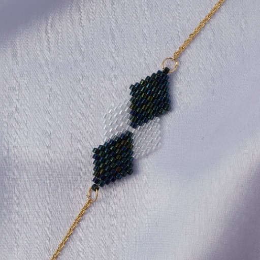 The Blue Mirage Bracelet captures the allure of a shimmering oasis — where cool blues meet crisp white and rich black in a striking diamond pattern. Handwoven with precision using high-quality glass beads, this bracelet is both modern and timeless. The alternating tones and shapes create a mesmerizing, prismatic effect, while the gold-tone chain adds a warm, luxurious finish.