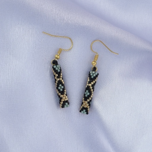 Unleash your inner strength and elegance with the Dragon Scale Earring. Crafted with precision using tiny glass beads, this earring features a sleek rectangular form adorned with a mesmerizing scale-like pattern. The shimmering dark tones paired with golden zigzags mimic the mythical texture of dragon scales, evoking a sense of power, mystery, and bold style.