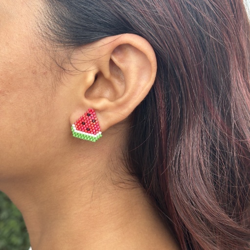 Bring a fresh and fun vibe to your look with the Melon Pop Studs Earring. These charming handcrafted earrings feature a vibrant seed bead design that captures the juicy essence of a watermelon slice, with bright red, crisp white, and lively green hues accented by tiny black seed details.