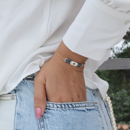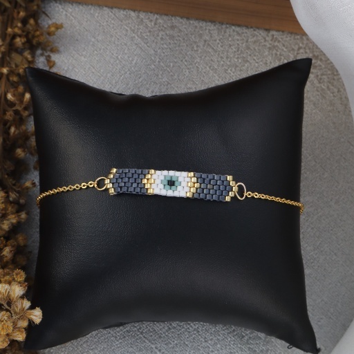 Mysterious and powerful, the Shadow Shield Bracelet features a sleek grey evil eye motif handwoven with precision and care. Symbolizing protection and inner strength, this bracelet is set on a gold-toned adjustable chain for a balanced mix of elegance and symbolism. The soft grey tones evoke calm confidence, while the central eye serves as a modern talisman against negativity. Perfect for daily wear or as a meaningful gift, this piece brings both style and strength to your wrist.