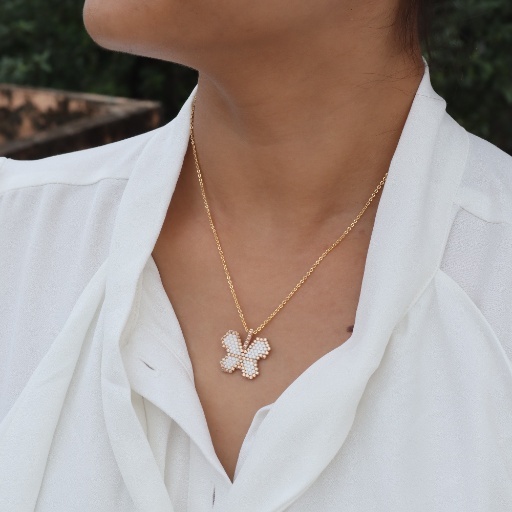 Light as a breeze and radiant with elegance, the Whisperwing Butterfly Pendant captures the beauty of transformation and gentle strength. This enchanting pendant is meticulously handwoven in the shape of a butterfly using delicate white and rose-gold seed beads. Its airy, symmetrical wings and fine craftsmanship make it a graceful symbol of renewal and hope. Dangling from a refined gold chain, it’s the perfect accessory to uplift everyday wear or add a whimsical touch to special occasions.