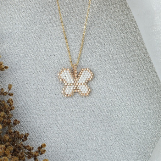 Handwoven butterfly pendant with white and rose-gold seed beads